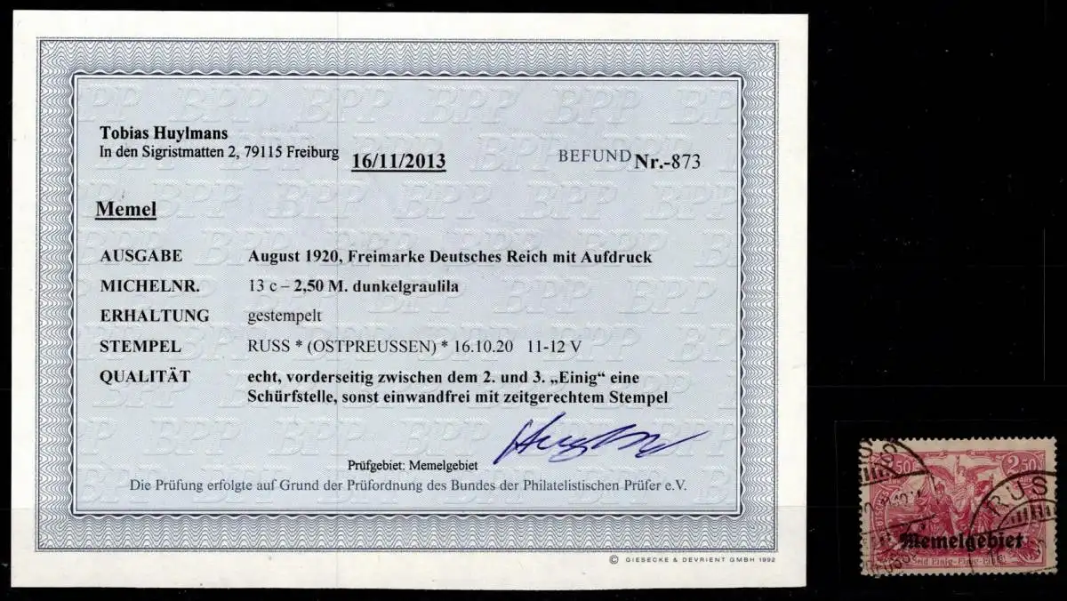 Memel 13 c gestempelt Befund Huylemans BPP #OF985