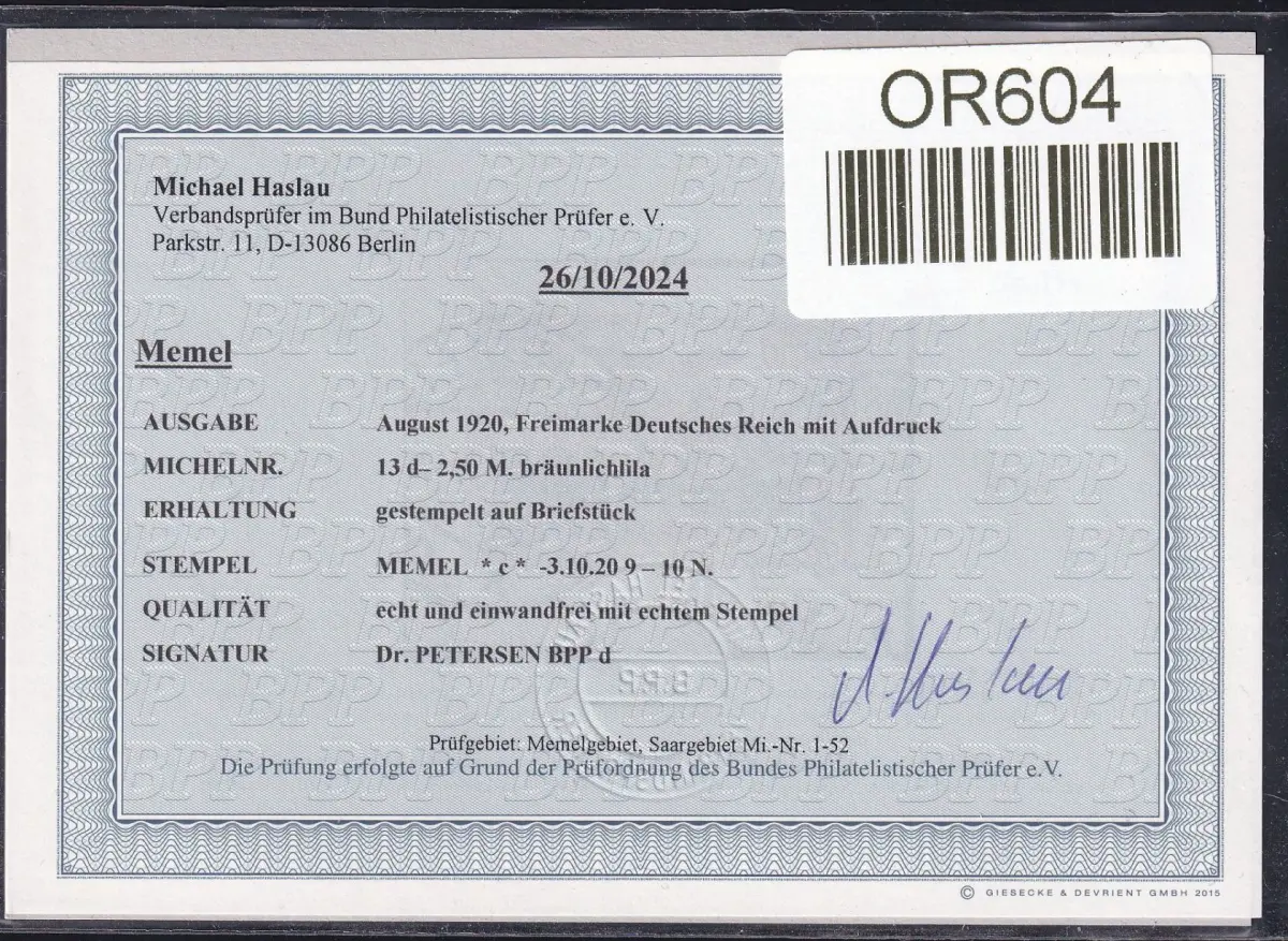 Memel 13 d gestempelt Befund Haslau BPP #OR604