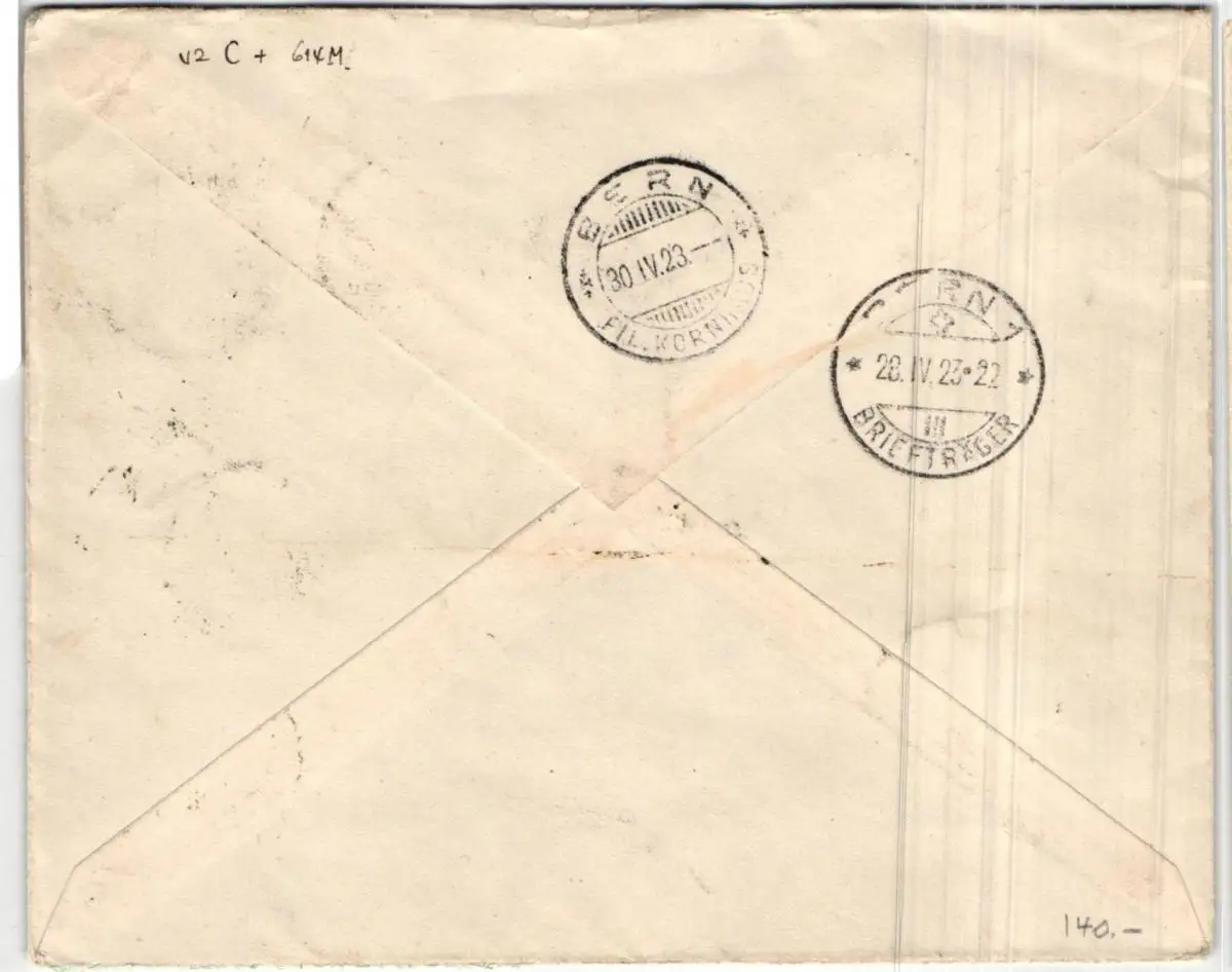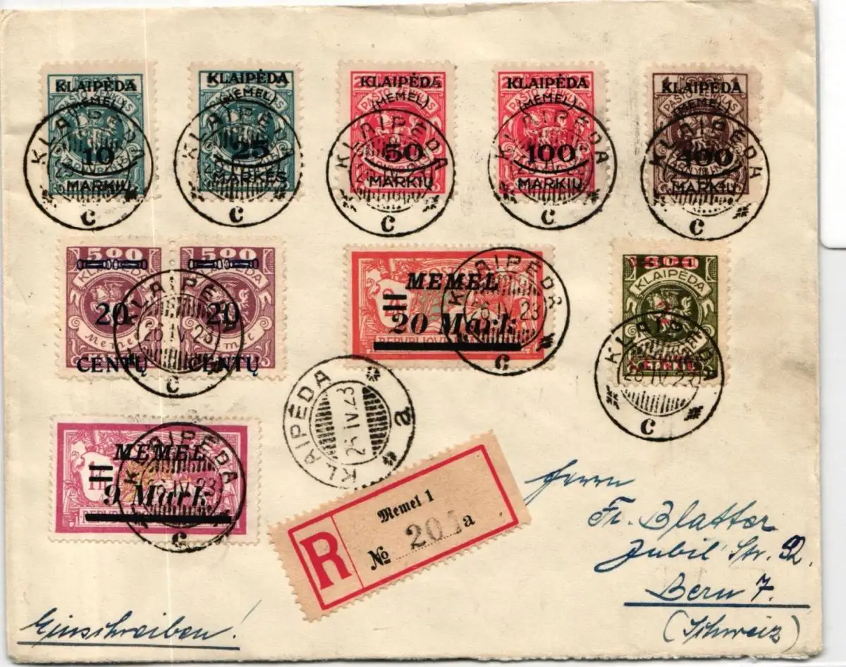Memel Mi.-Nr. 171 u.a. auf Brief 1923, Freimarken mit Aufdruck 2 C auf 500 M und guter ZuF (MiF Mark und Cent) auf philat. R-Brief nach Bern