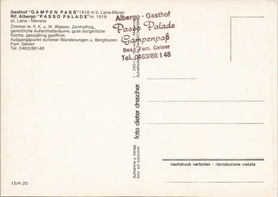 Meran Merano Gasthof GAMPEN PASS Albergo PASSO PALADE in LANA 1980