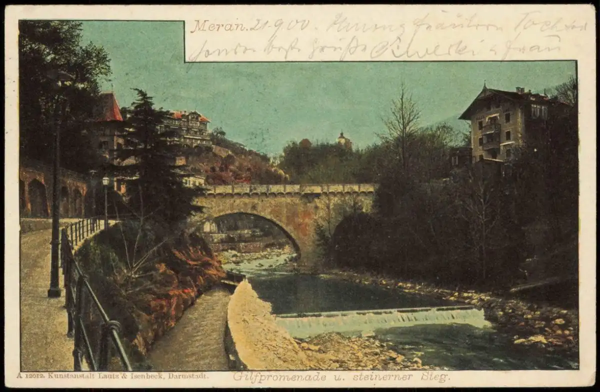 Meran Merano Ortsansicht mit Brücke, Gilf-Promenade u. steinerner Steg 1910