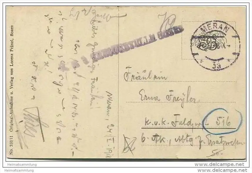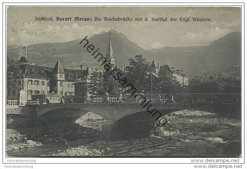 Meran - Reichsbrücke mit d. Institut der Engl. Fräulein - Verlag Lorenz Fränzl Bozen - Feldpost (E11197) gel. 1918