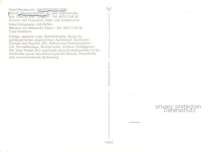 Meran_Merano Hotel Restaurant Bayrischer Hof Meran Merano postalisch nicht gelaufen nach 1965 Erhaltung siehe scans [FriedD77] Frierer