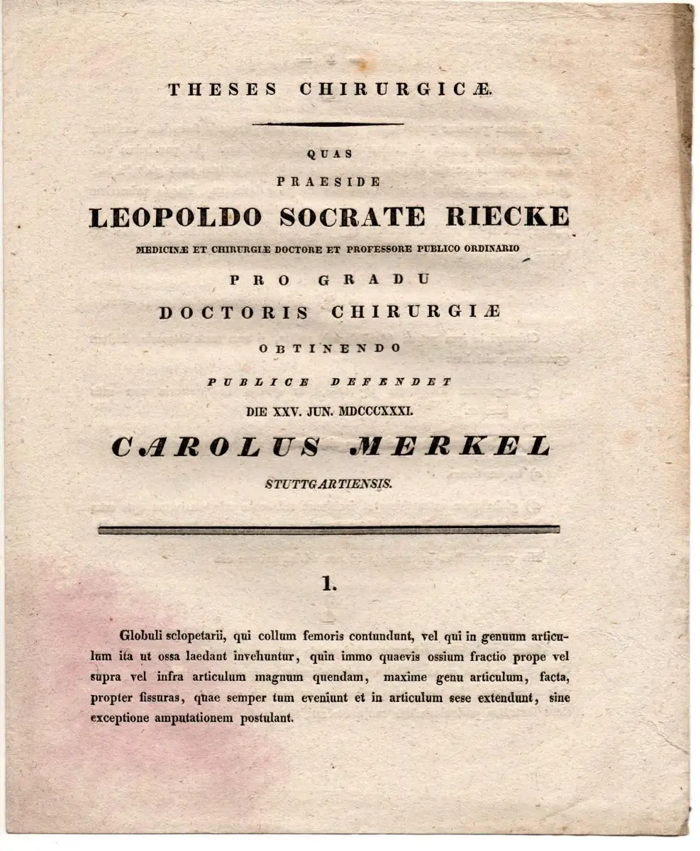 Präses: Leopold Sokrates Riecke; Disputatio: 1831-06-25; 2 Bl., 24 cm, Staubrand, Ecke rotfleckig.