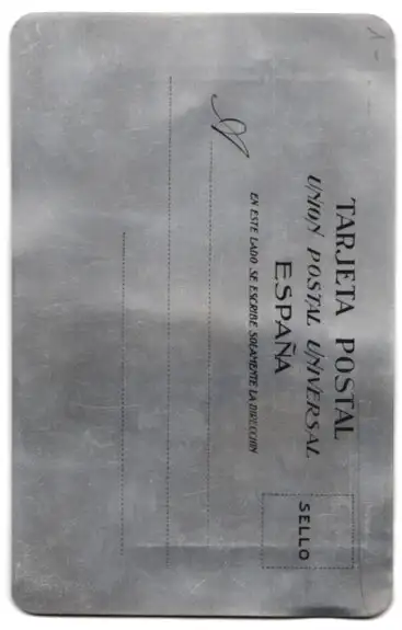 Personenbezogene Daten auf der Rückseite der Karte wurden durch blauen Textmarker unkenntlich gemacht. Die blauen Stellen sind auf die Vorderseite durchgeweicht und wirken sich negativ auf das Postkartenfoto aus