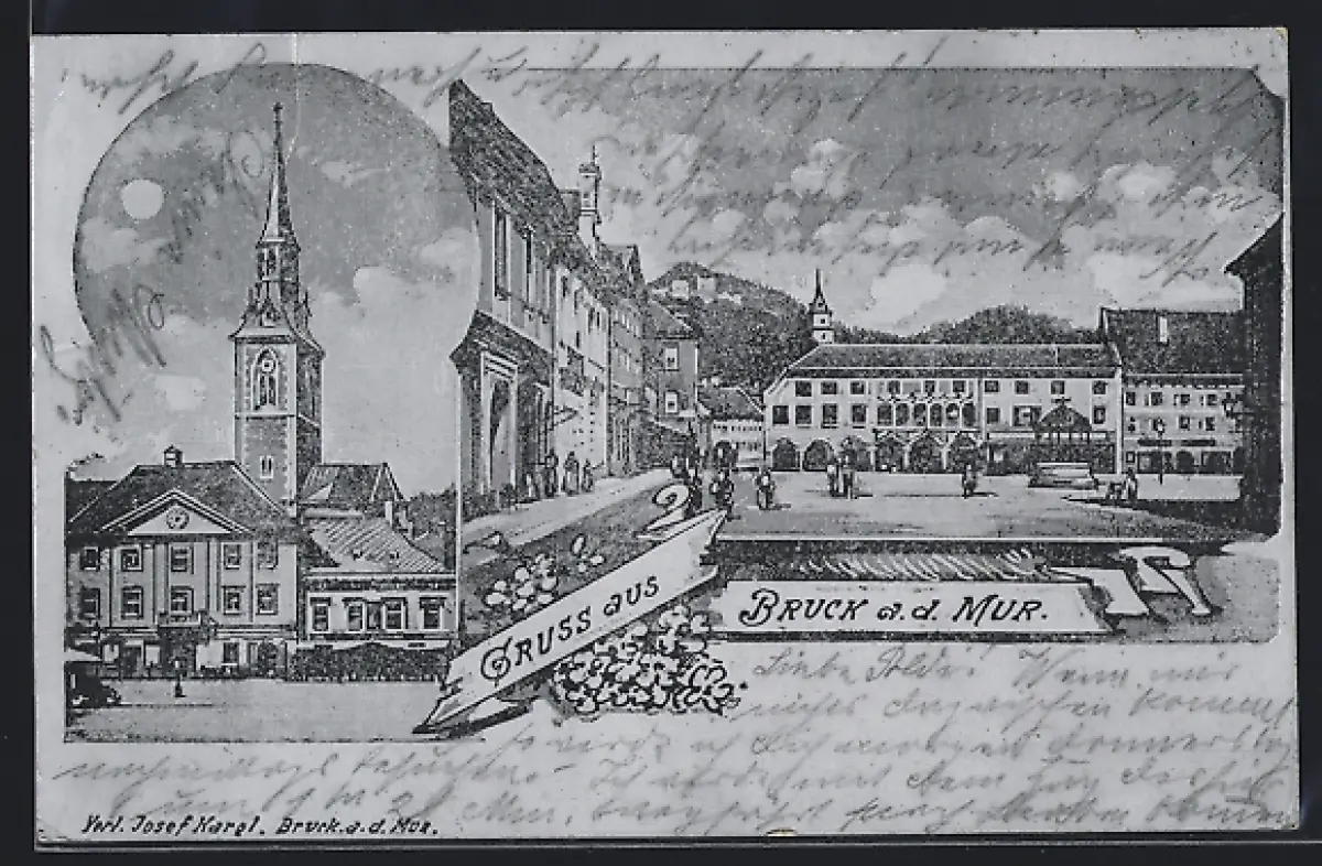 Metallfolie-AK Bruck a. d. Mur, Kirche und Hauptplatz
