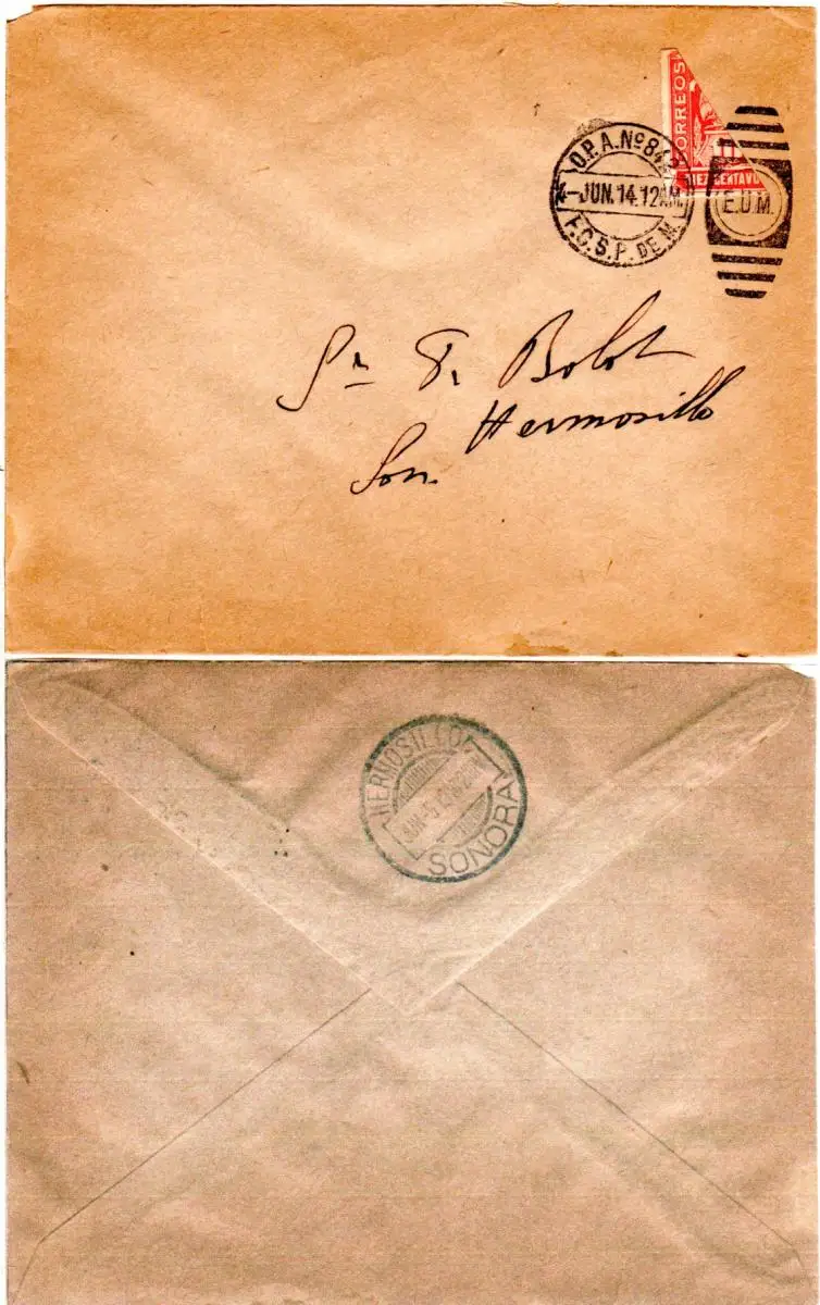 Linke Diagonalhälfte auf Brief v. Juni 1914 mit rückseitigem Ankunftstempel v. Sonora