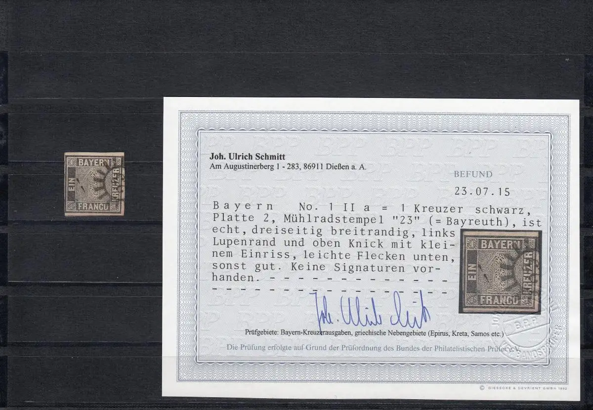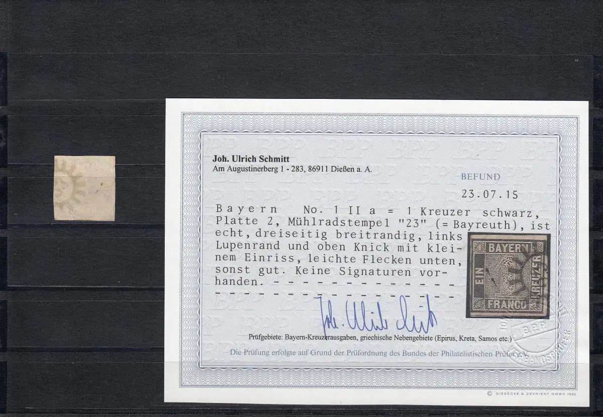 MiNr. 1 II a Platte 2, Mühlradstempel 23 (Bayreuth), BPP Befund