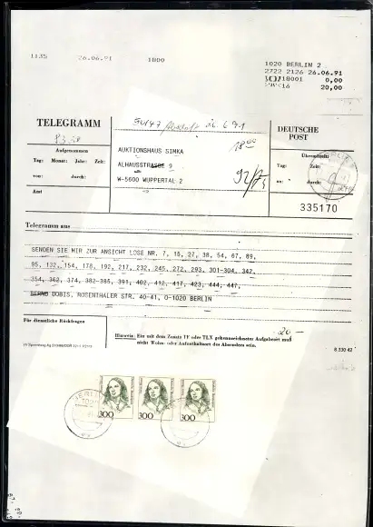 Michel Nr. 1433 (3) auf Telegramm, Abschrift, Deutsche Post