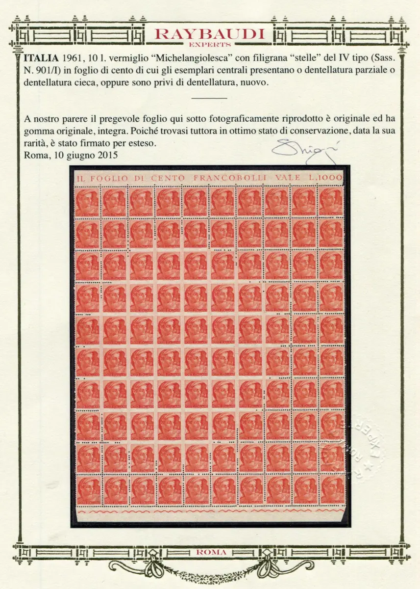 Michelangelo Lire 10 Sorten ungezähnt und Blindverzahnung A - Michelangelo Blatt mit 100 Exemplaren ohne Seitenränder, 13 Exemplare ungezähnt und viele mit ein- oder mehrseitiger Blind- oder Teilverzahnung - Set wohl Unikat - Raybaudi Gold Zertifikat - Sehr selten - Cod. 402/WEB Cod. 402/WEB