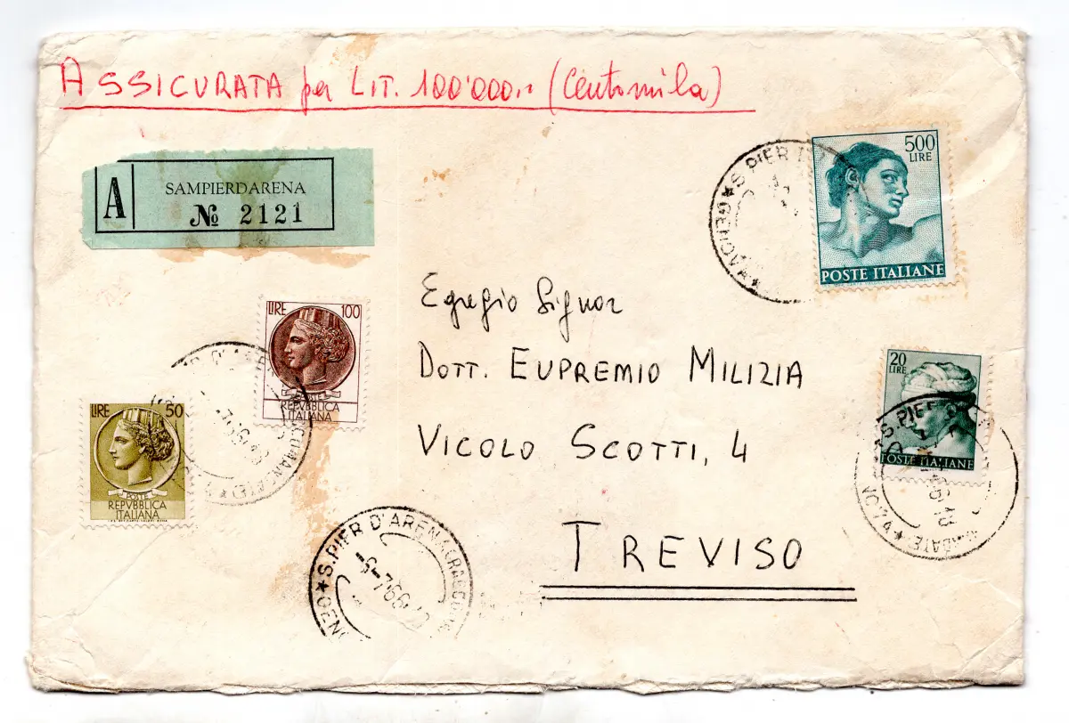 Umschlag - - Michelangelo Lire 500 Nr. 916 + ergänzende Syrakus-Serie auf versichertem Umschlag (Lire 100.000) reiste am 6.7.66 von Sanpierdarena nach Treviso - perfekter Umschlag mit allen kompletten Wachsabdrücken auf der Rückseite und der Schutzschnur - Seltener nicht philatelistischer Postgebrauch Cod. 2509/WEB