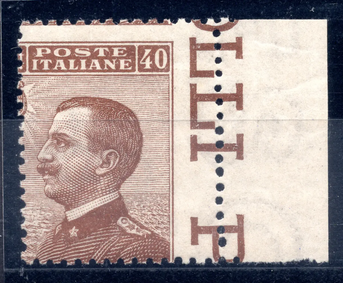 Michetti Cent. 40 Sorten vertikale Verzahnung nach rechts verschoben Vollgummi - Michetti Cent. 40 n. 84n schönes Exemplar b. von f. mit stark nach rechts verschobener vertikaler Verzahnung - Ungewöhnlich, stammt aus der letzten senkrechten Reihe des Blattes daher sind rechts die Randbeschriftungen zu sehen - Kat. euro 150 Code 231/11