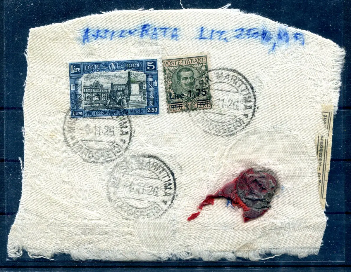 - Miliz I Lire 5 Nr. 209 + Ergänzung Nr. 182 auf Stofffragment von Massa M. am 6.11.26 versichert - Interessante Nr. 117/A
