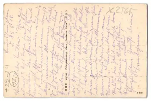 Personenbezogene Daten auf der Rückseite der Karte wurden durch blauen Textmarker unkenntlich gemacht. Die blauen Stellen sind auf die Vorderseite durchgeweicht und wirken sich negativ auf das Postkartenfoto aus
