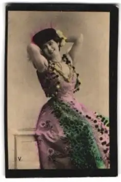 Mini-AK Dame in langem Kleid mit Blumenstickerei