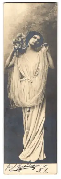 Mini-AK Dame in langem Kleid mit Rosenstrauss