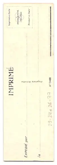 Personenbezogene Daten auf der Rückseite der Karte wurden durch blauen Textmarker unkenntlich gemacht. Die blauen Stellen sind auf die Vorderseite durchgeweicht und wirken sich negativ auf das Postkartenfoto aus