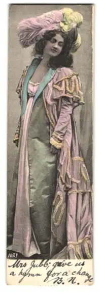 Mini-AK Frau in elegantem Kleid mit Federhut