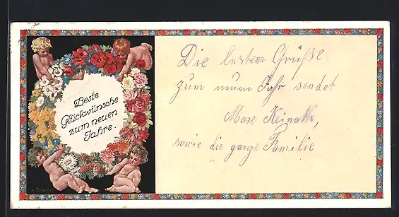 Mini-AK Kinder mit Blumenkranz und Neujahrsgruss