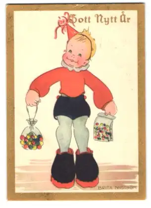 Mini-AK Kleiner Junge mit Bonbon-Tüten, Neujahrsgruss