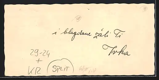 Personenbezogene Daten auf der Rückseite der Karte wurden durch blauen Textmarker unkenntlich gemacht. Die blauen Stellen sind auf die Vorderseite durchgeweicht und wirken sich negativ auf das Postkartenfoto aus