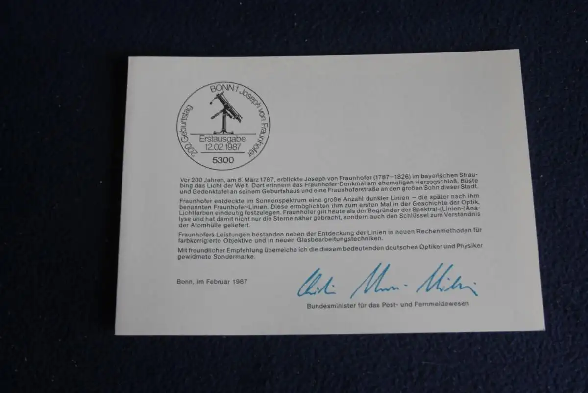 Ministerkarte zum Ausgabeanlaß: "Joseph von Fraunhofer"; 12.2.1987; MiNr. 1313