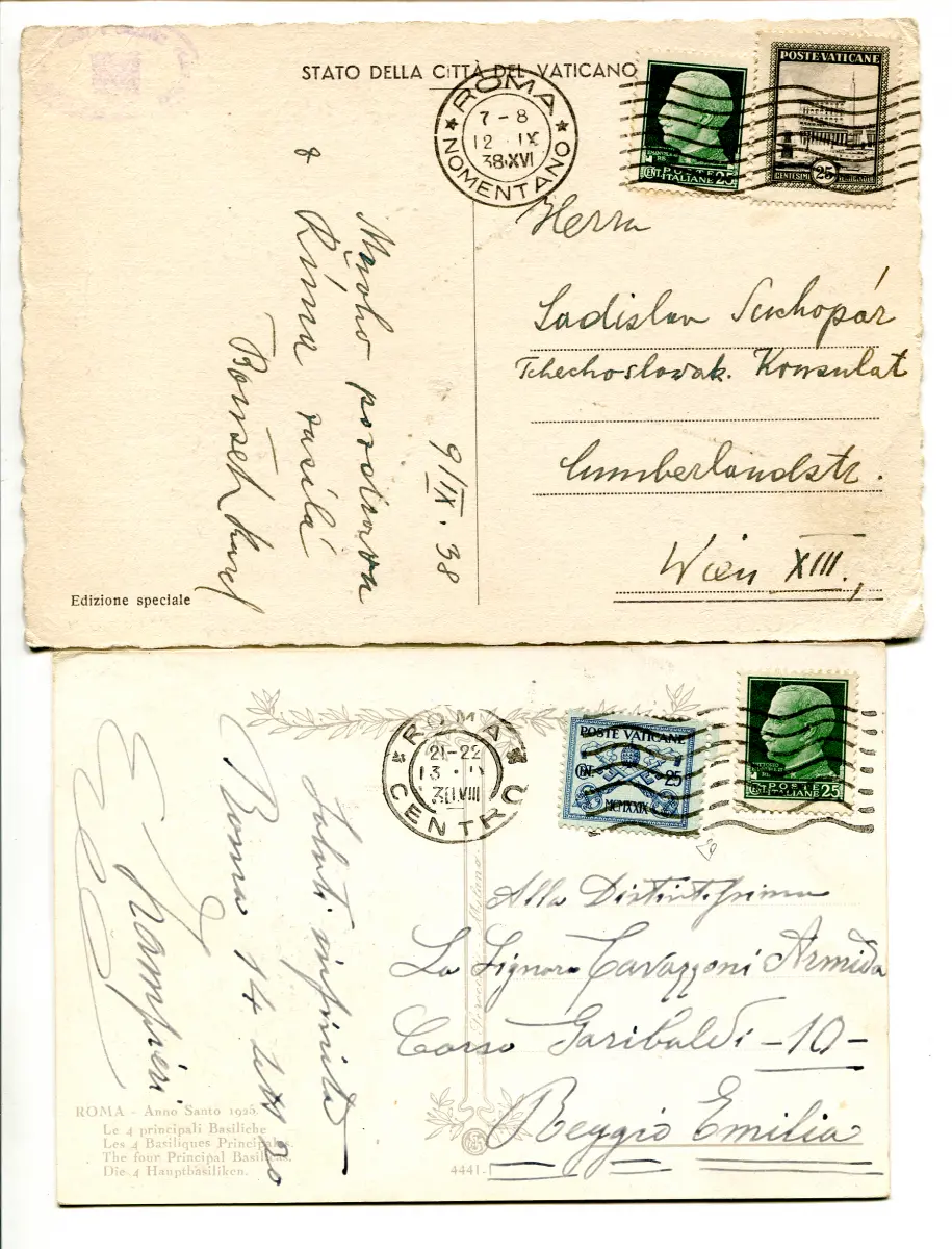 Mischfrankatur - Italien Vatikan AK - Mischfrankatur - Zwei Ansichtskarten pro Cent frankiert. 50 mit Briefmarke aus Italien Serie Imperiale ab Cent. 25 und Cent-Briefmarke. 25 des Vatikans (eine aus der Serie Conciliazione, eine Serie Giardini) - Interessante Zwillingsmischfrankatur Cod. 822/16