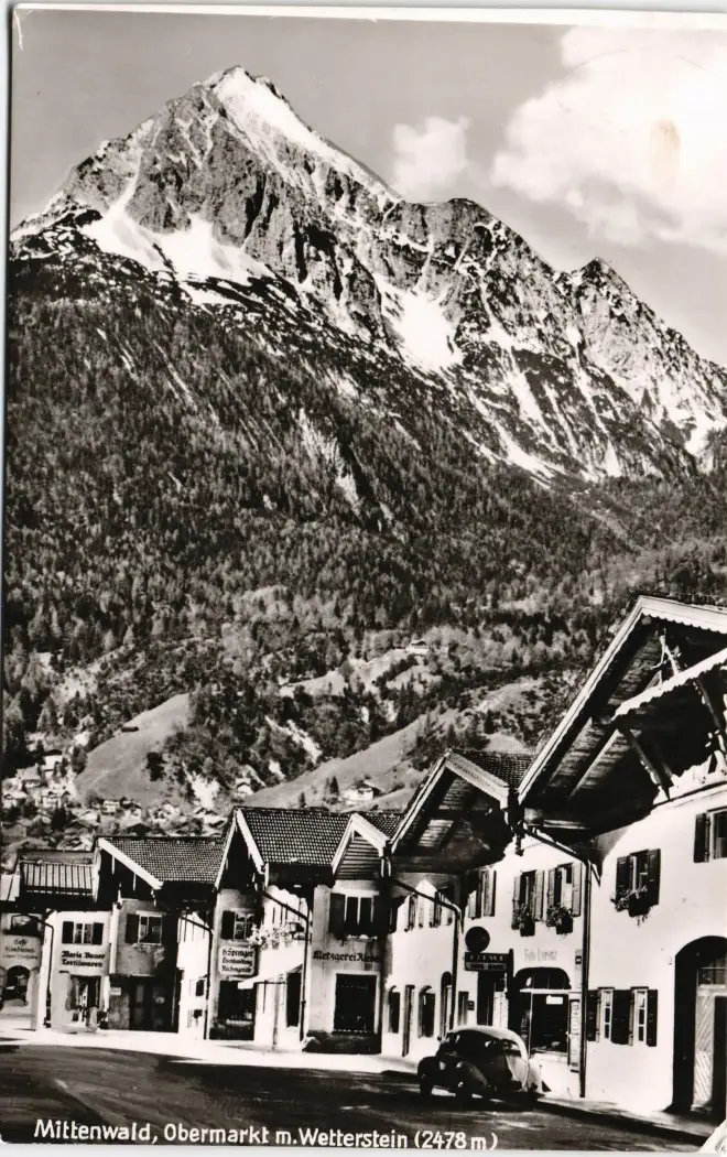 Mittenwald Obermarkt, Geschäfte, VW Käfer u. Blick Wetterstein 1963