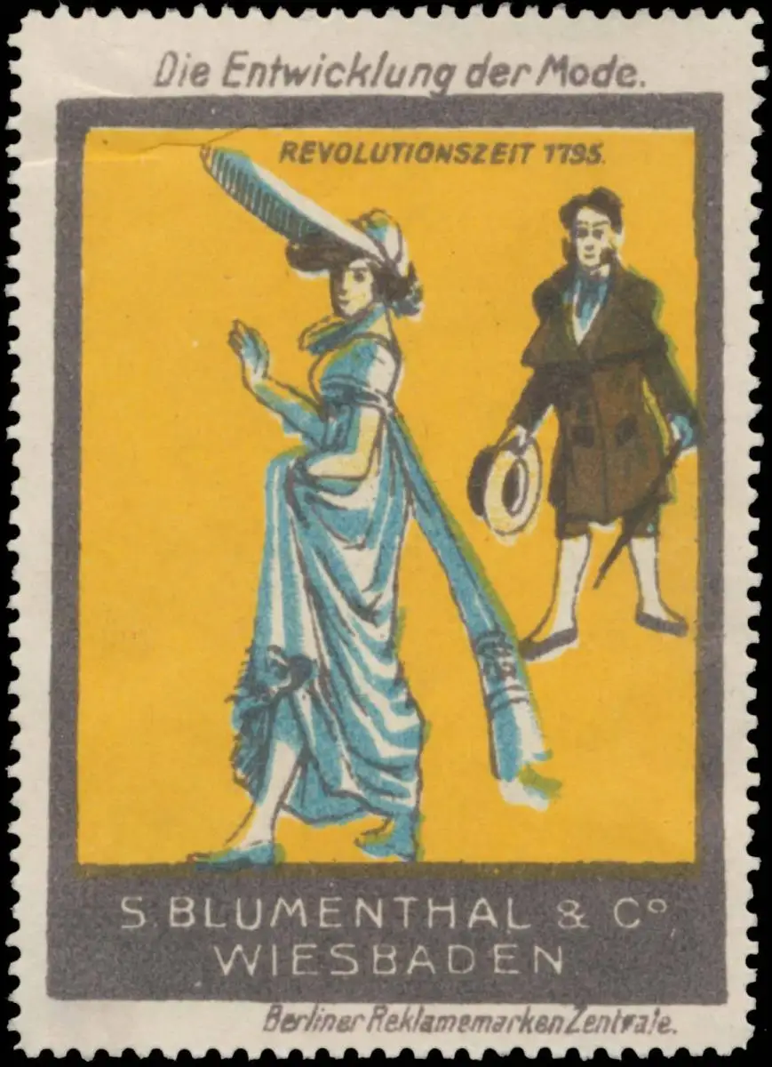 Die Entwickung der Mode, Druck: Berliner Reklamemarken-Zentrale, Berlin, Größe/Zustand: 6x5 , leicht geknickt, Original alte Reklamemarke die seinerzeit für die Werbung benutzt wurde