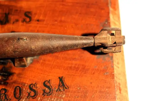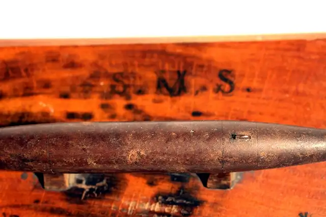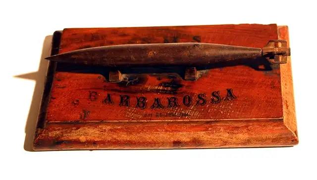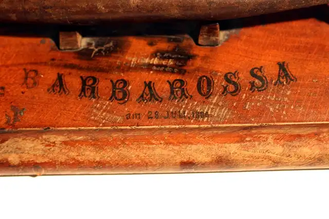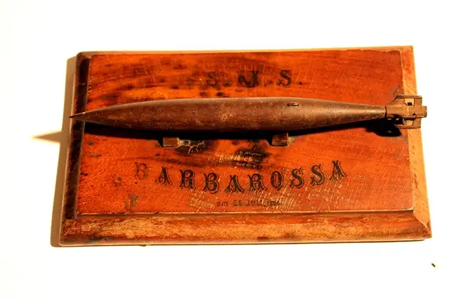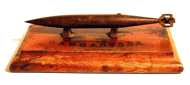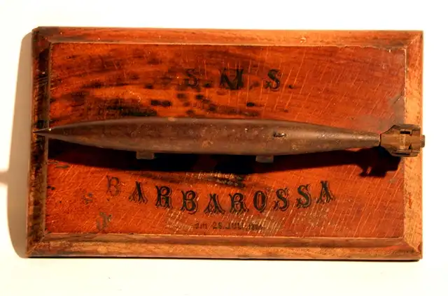 Modell eines Schiffstorpedos der SMS Barbarossa zu Erinnerung an ihrer Versenkung am 28. Juli 1880 (Datum ist auf dem Modell). Die Barbarossa wurde auf der Werft Robert Duncan and Company in Greenock gebaut. 1849 wurde sie im Zuge der Schaffung einer Reichsflotte für 451 Gulden nach Deutschland verkauft, dort wurde sie zum Kriegsschiff Barbarossa umgebaut. Am 28. Juli wurde das Schiff im Beisein des Kronprinzen durch einen Torpedoschuss von der SMS Zieten versenkt, später wieder gehoben. Das Resultat der Torpedo-Sprengung wurde auf dienstliche Anweisung fotografiert. Modellgröße: Brett 24,0 x 14,0 x 3,0 cm, Torpedo: Länge 22,5 cm, Durchmesser 2,5 cm, Modellgesamthöhe 6,5 cm.