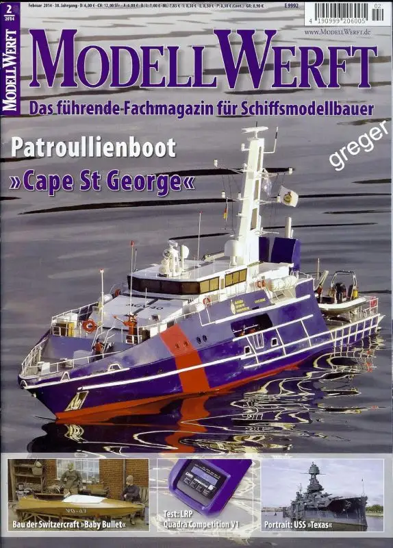 Aus dem Inhalt: Fahrmodelle: Paula 3-Umbau zum Fluss-Arbeitsboot --- Bau der Switzer Graft Baby Bullet, Teil 2 --- Andreas baut sich eine Eider, Teil 4 --- Cape St George Segelmodelle: Bretonischer Thunfischfänger Requin --- Standmodelle: Adler von Lübeck, Teil 2 --- Motorschiff Martha --- Schiffsportrait: USSTexas --- U-Jäger UJ2209 --- Schiffsbilder: Offshore Mehrzweckschiff Noortruck --- Schwergut-Mehrzweckfrachter Happy Diamond