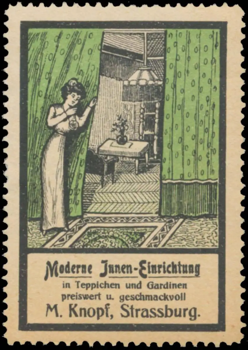 in Teppichen und Gardinen, Größe/Zustand: 5x4 , guter Zustand, Original alte Reklamemarke die seinerzeit für die Werbung benutzt wurde