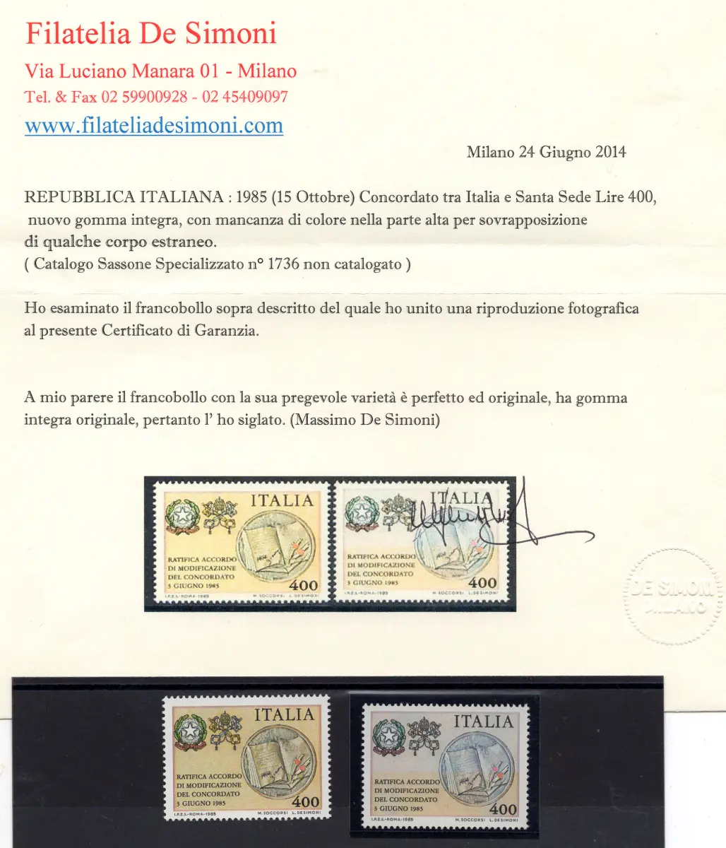 Modifikation Konkordat gelbe Sorte unvollständig Vollgummi - Konkordierte Modifikation Nr. 1736 mit unvollständigem gelben Druck oben auf der Vignette - Unveröffentlicht Cod. 830/13