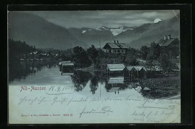 Mondschein-AK Alt-Aussee, Flusspartie mit aufgehendem Mond