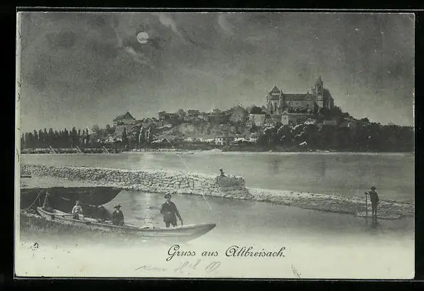 Mondschein-AK Altbreisach, Ortsansicht mit Kahnpartie
