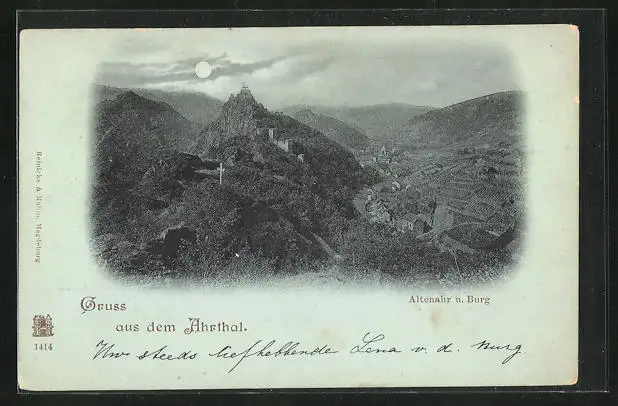 Mondschein-AK Altenahr, Ortsansicht mit Burg