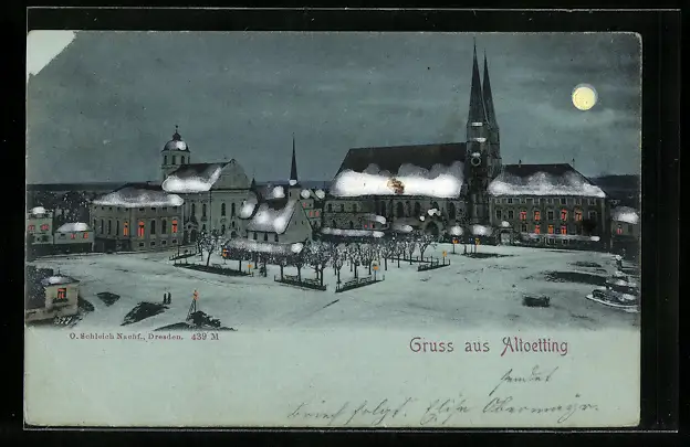 Mondschein-AK Altoetting, Ortspartie mit Kirche