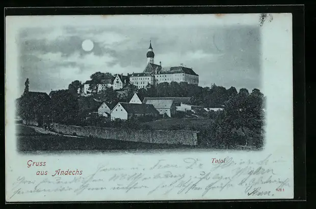 Mondschein-AK Andechs, Totalansicht mit Kirche