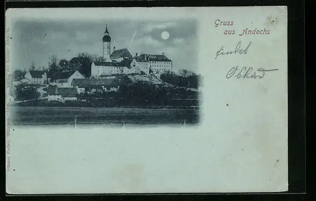 Mondschein-AK Andechs, Totalansicht mit Kirche