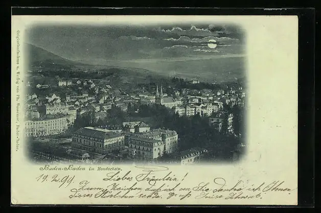 Mondschein-AK Baden-Baden, Blick auf den Ort