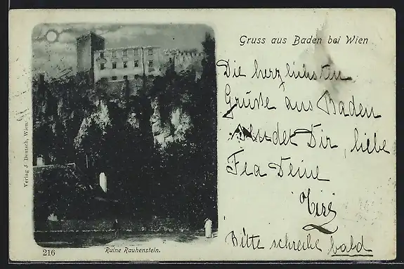 Mondschein-AK Baden bei Wien, Ruine Rauhenstein