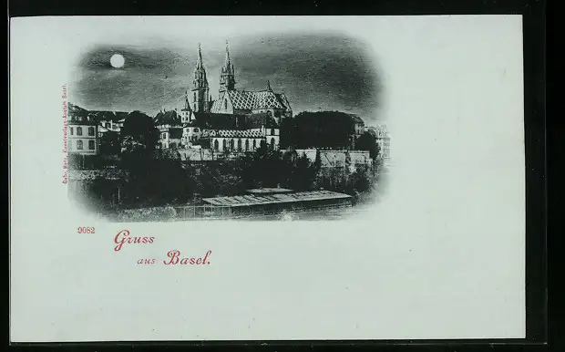 Mondschein-AK Basel, Ortspartie mit Kirche