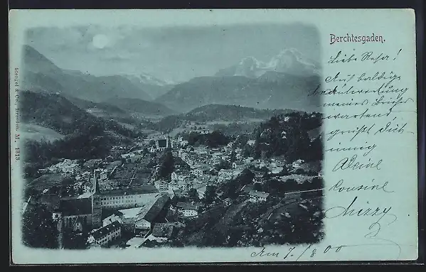 Mondschein-AK Berchtesgaden, Teilansicht mit Kirche
