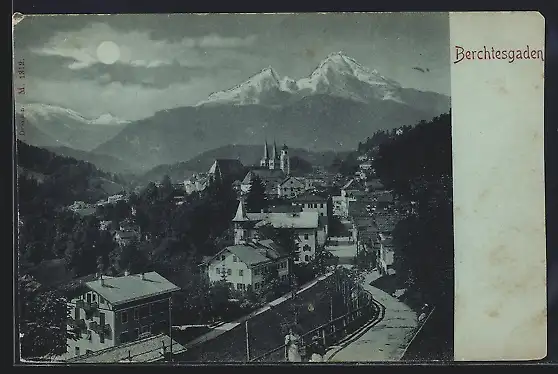 Mondschein-AK Berchtesgaden, Teilansicht mit Kirche und Strassenpartie