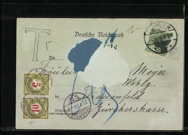 Personenbezogene Daten auf der Rückseite der Karte wurden durch blauen Textmarker unkenntlich gemacht. Die blauen Stellen sind auf die Vorderseite durchgeweicht und wirken sich negativ auf das Postkartenfoto aus