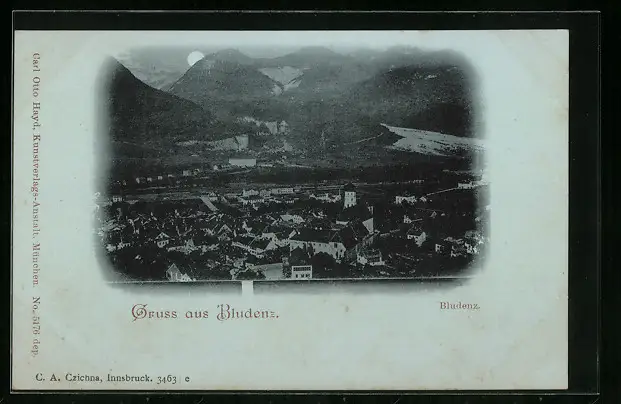 Mondschein-AK Bludenz, Totale mit Gebirgswand