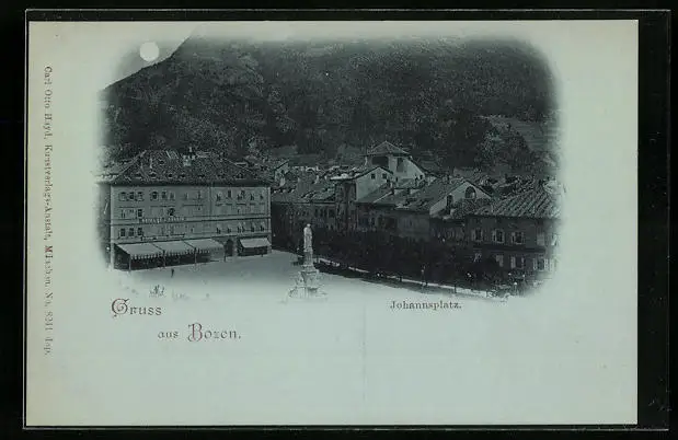 Mondschein-AK Bozen, Ortsansicht mit Johannsplatz