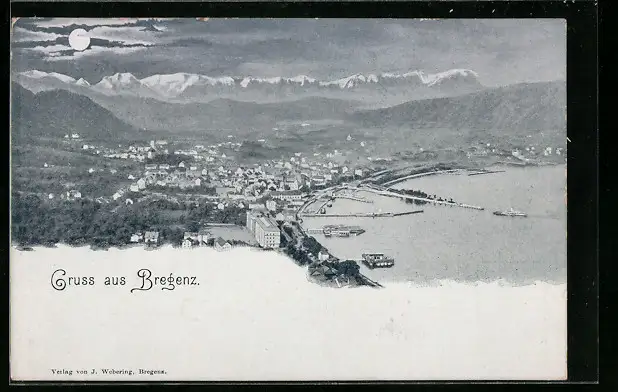 Mondschein-AK Bregenz, Panorama mit Mondschein