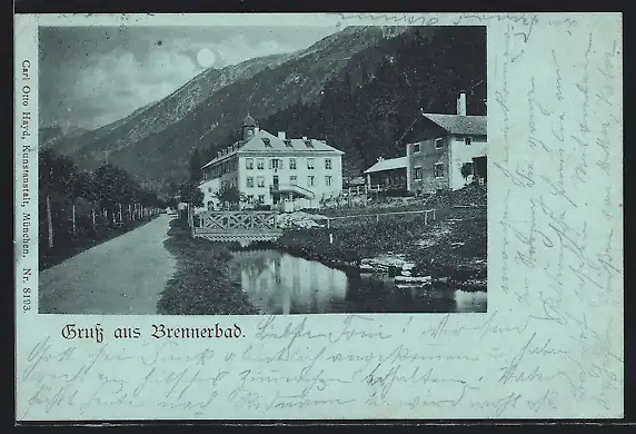 Mondschein-AK Brennerbad, Ortsansicht mit Brücke