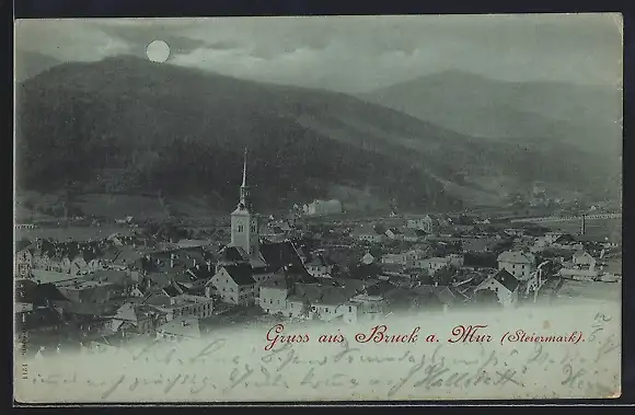 Mondschein-AK Bruck a. Mur, Gesamtansicht mit der Kirche